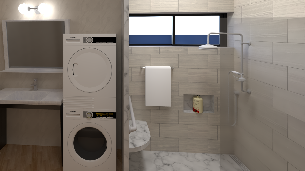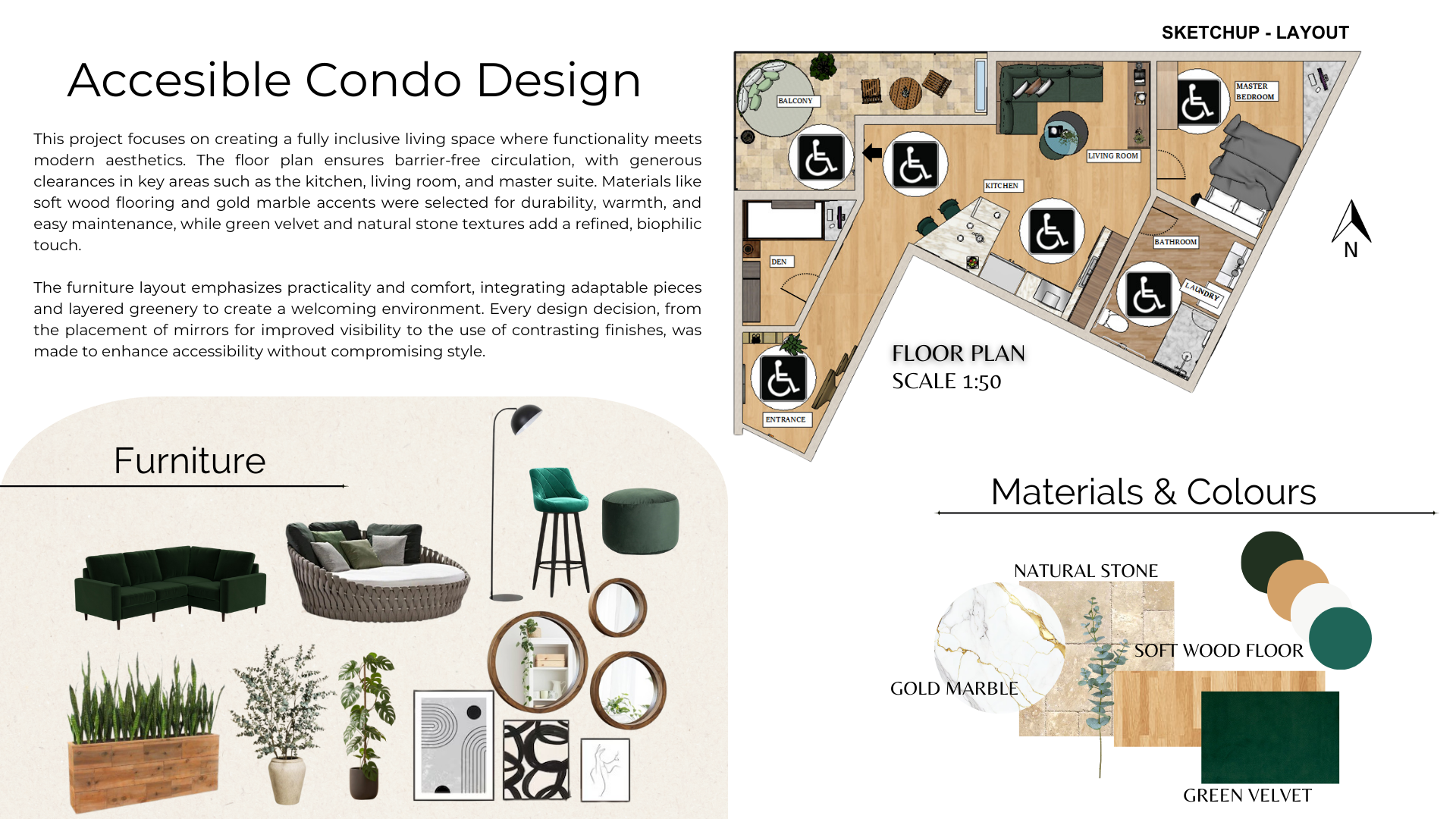 Designed for a university student moving into his first home, this condo focuses on accessibility, independence, and a warm atmosphere for hosting friends. The layout provides barrier-free circulation through the kitchen, living room, bedroom, and bathroom, ensuring comfort and ease of movement in daily routines.